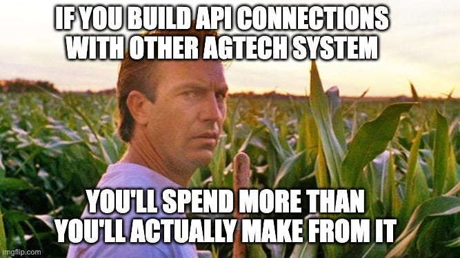 Oh I’ve been wanting to talk about this one for awhile. I even put a poll out on Linkedin about it asking you what you wanted to hear about and this is it. Now before I go into detail I’m going to say this one thing, I’m 100% a proponent of API connections in AgTech and beyond. I want them to work as best as possible and also let’s be honest, the industry would sort of suck right now without them.